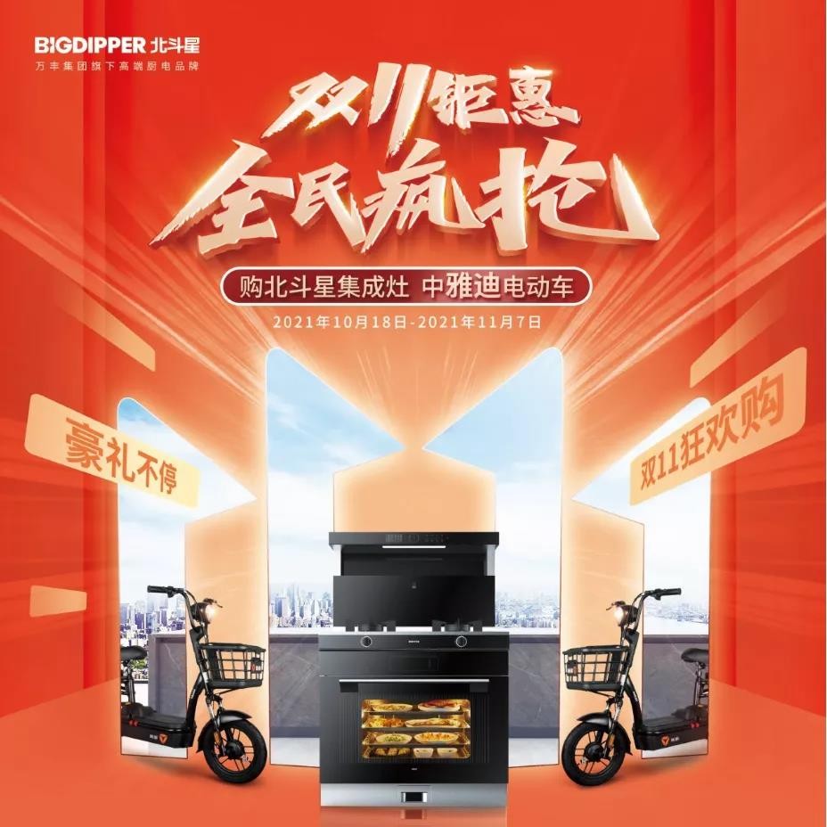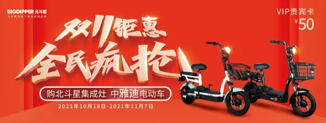活動期間,顧客憑“全民瘋搶”VIP貴賓卡消費,實交金額滿5000元以上,即可參加公司總部直播抽獎,“購北斗星集成灶,中雅迪電動車”活動,豪華雅迪等你開回家?。ㄈ珖勂?00臺,針對終端消費客戶)