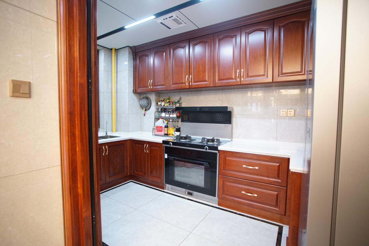 整個廚房的設計有別于傳統(tǒng)中式風繁復富麗、濃墨重彩的特點,而是以高雅配色和簡約線條設計,將經典與時尚結合,打造極具現代生活特色的極簡新中式廚房。柜區(qū)選用沉穩(wěn)的“菩提棕”木紋配色,視覺上營造穩(wěn)重之感,深淺層次分明,讓廚房顯得低調而有內涵。