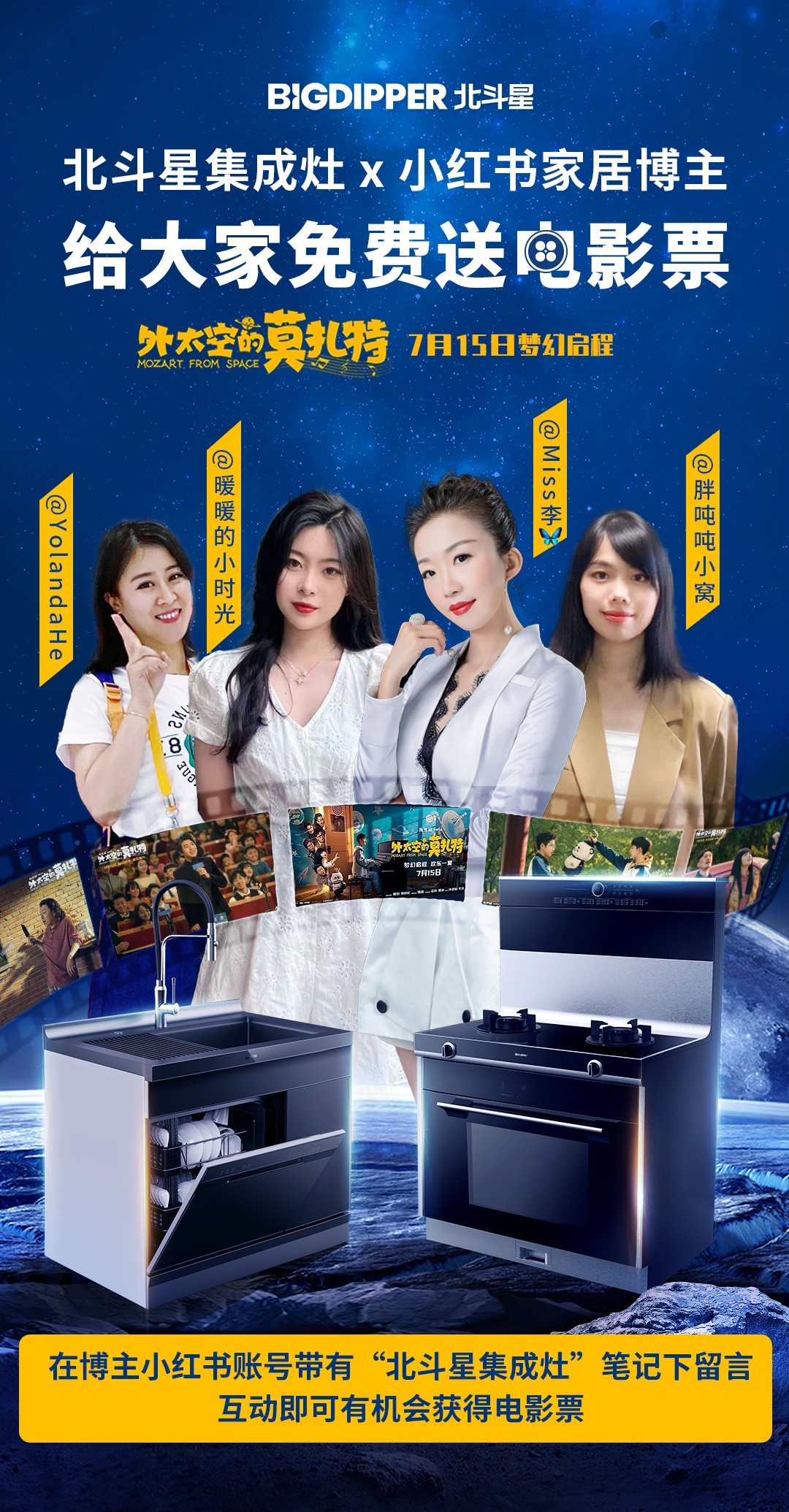 參與方式3:打開小紅書APP,搜索海報內博主IP名稱 @Miss李@YolandaHe @胖噸噸小窩 @暖暖的小時光,在帶有“北斗星集成灶”的相關筆記/視頻評論區進行互動留言~將有機會獲得《外太空的莫扎特》電影票哦!